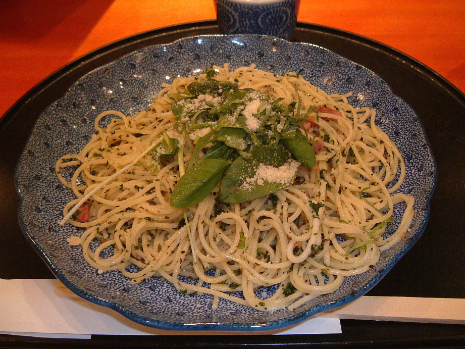 その後、私は冷たいビールを空腹に飲むと、腹がゆるむので、飲む前に軽く食事(麺類、おもち、ぜんざい等)を食べるようにしてる。今回は、江南ラーメンの向かいにある「五右衛門」なる店で「和風バジル」のパスタ(画像参照)を食べたのだが、値段(1000円)のわりにいただけなかった。箸で食べるのもイマイチだ。