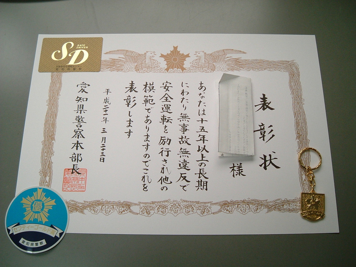今日は画像の通り、無事故無違反15年以上で、表彰をしてもらってきた。あ~恥ずかしかった、拍手が飛び交うんだもんね。